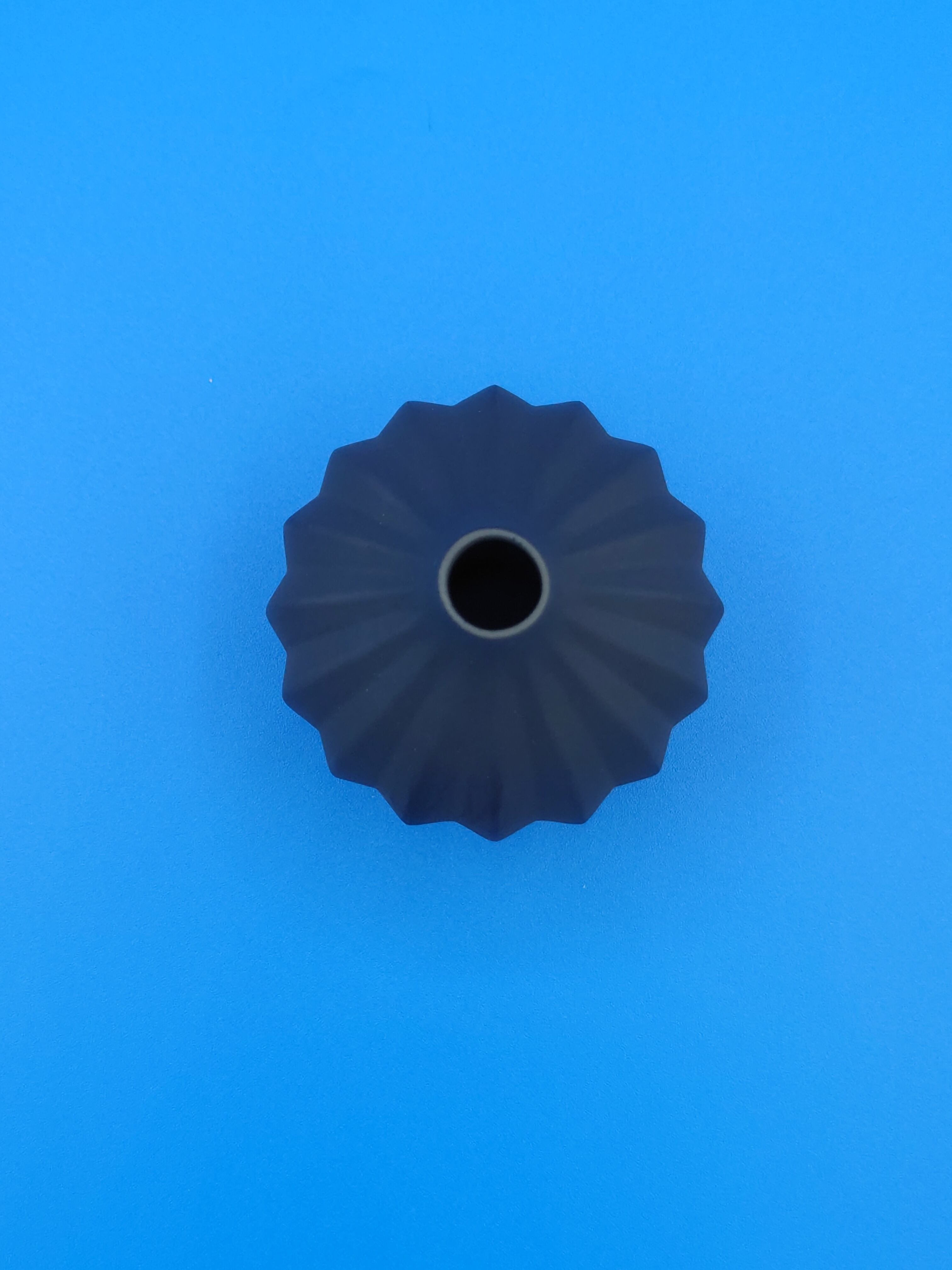 一輪挿し 桔梗(ききょう)。桔梗のつぼみのようなぷっくりとしたしずく型に、花びらの形のような凹凸を施したミニサイズの一輪挿しです。手のひらに収まる大きさなので、軽くて持ち運びやすく、場所を取りません。