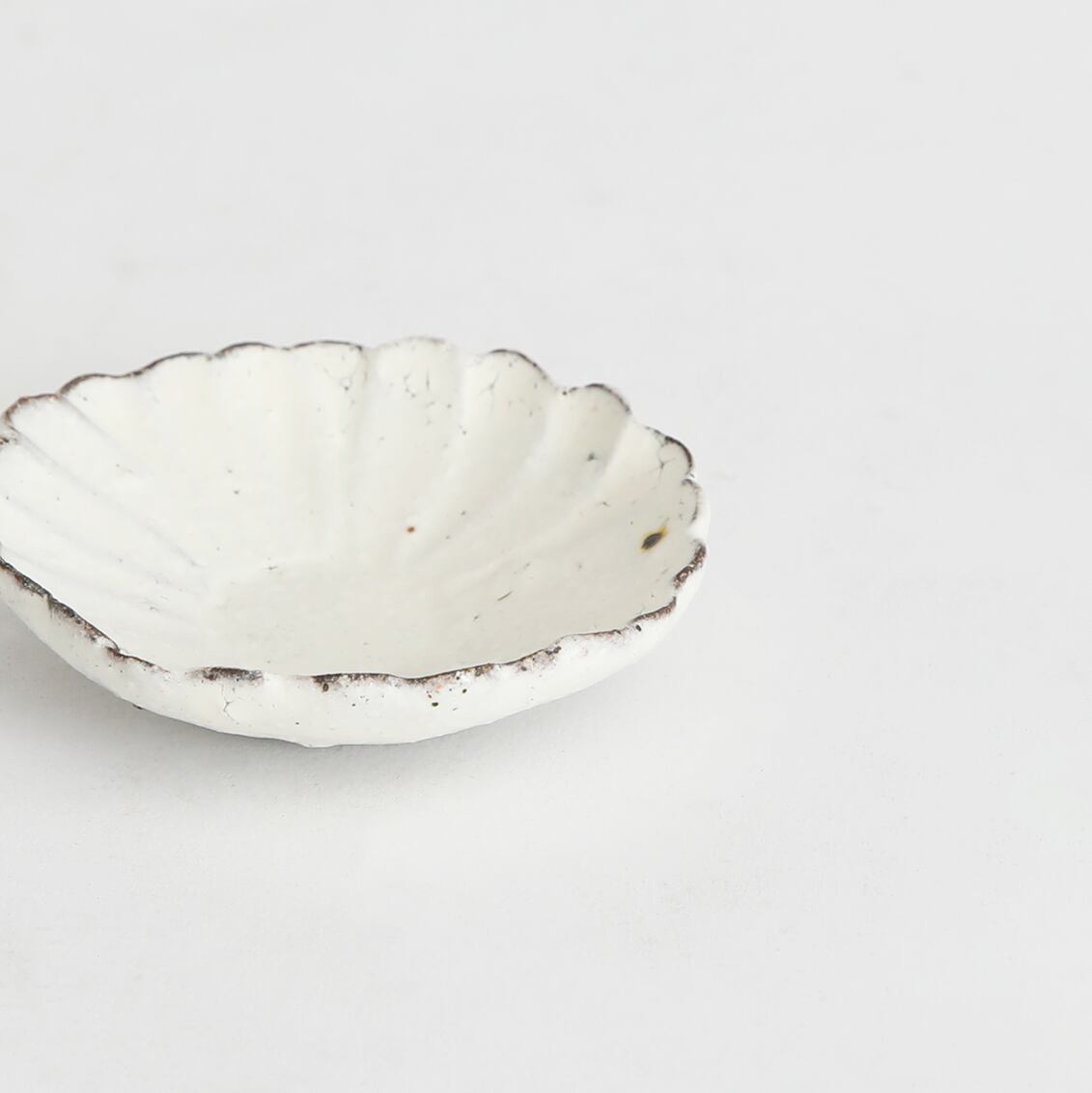 一枚一枚花びらの幅を変えて、風に揺れ動くお花をイメージした小さなお皿です。琥珀色の模様のある、Shiromoegi。箸置きとして、お香の受け皿として。またワンプレートにのせて、仕切り皿として活躍してくれます。
