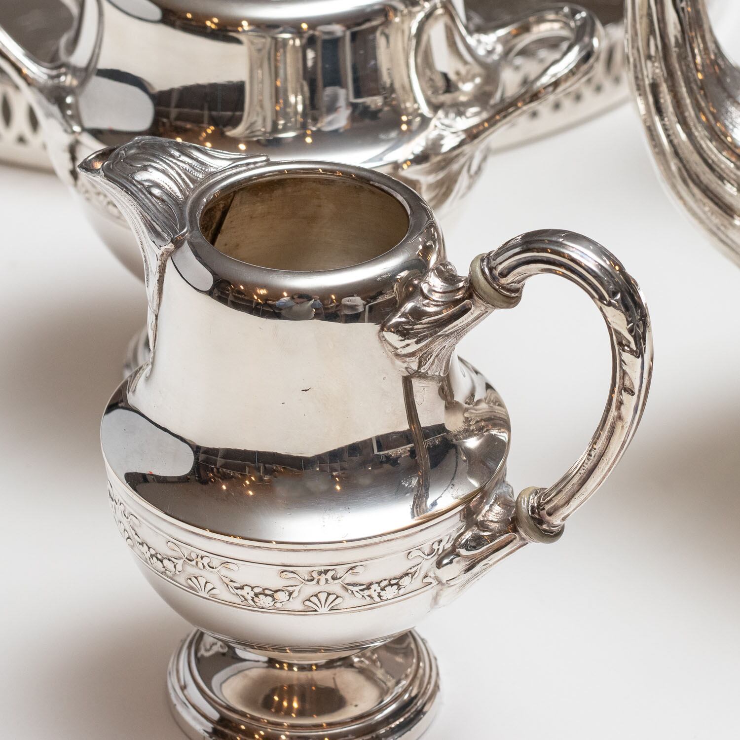 シルバープレートのティ-ポット、コーヒーポット、シュガーポット、ミルクジャグ、プレートのセットです。