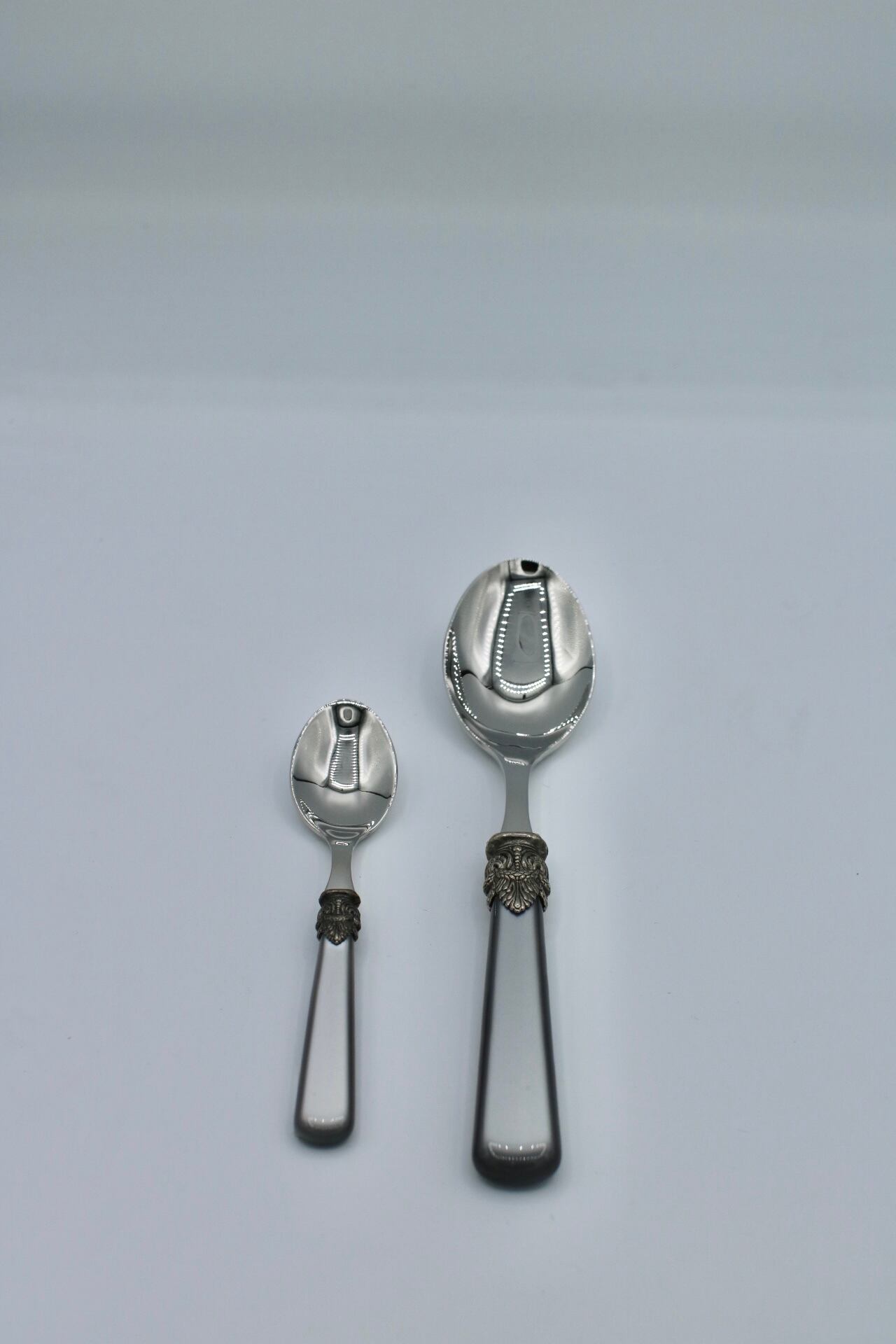 アンティーク調のエレガントなカトラリーシリーズ「ナポレオン」。柄の部分には中世ヨーロッパで使用されていたタッセルをモチーフに使い、アクリル樹脂のカラーとのバランスも良く品のあるデザインに仕上がっています。